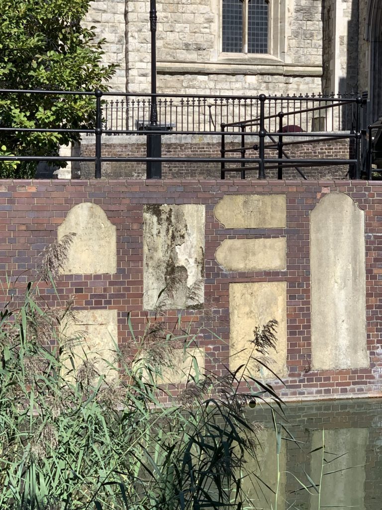 Less traditionally, the architects incorporated a montage of gravestones into the plinths and the sides of the walls, adding a shot of memento mori for anyone having a cigarette. The grave-stones are a valuable habitat for lichens and mosses.